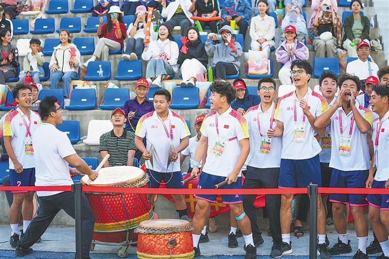 锣鼓声、助威声、欢呼声……早在赛前热场时,看台上的氛围已十分热烈。